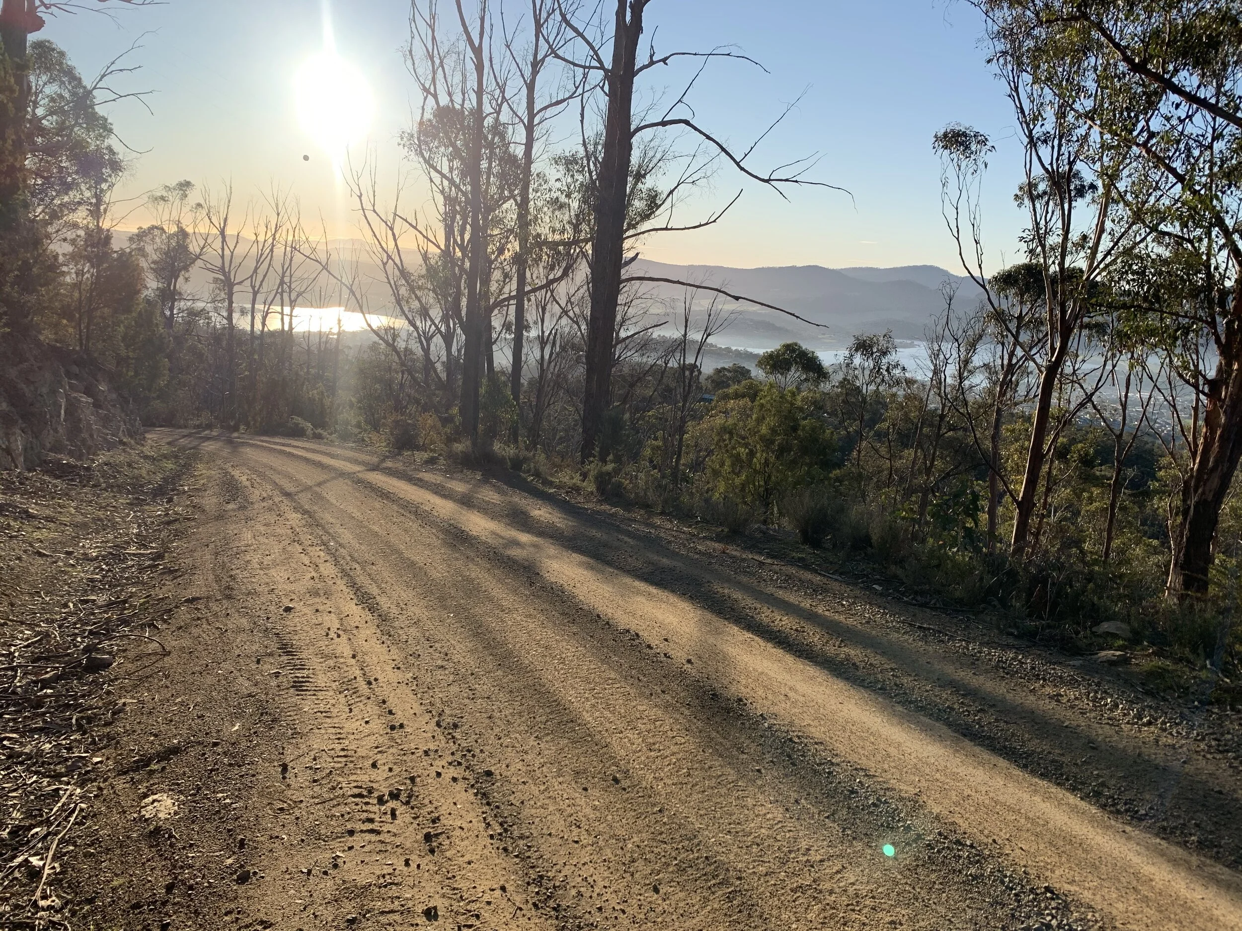 Back onto dirt climbing away from anything resembling traffic up to the saddle overlooking the majestic Huon Valley.